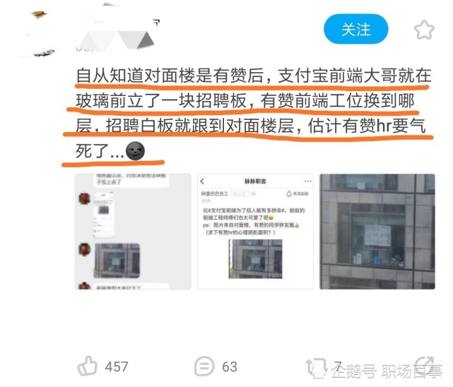 支付宝的这一波操作让网友们笑弯了腰,,据说为了能够起到更好的效果,有赞的前端工位换到哪一层,支付宝的招聘白板就会跟到对面楼层。不少网友都笑称有赞HR要被气死了,纷纷喊话HR赶紧怼回去。