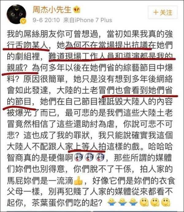 被部分网友人身攻击了十几年,周杰才在2017年发布了一篇长文反驳,“当初如果我真的强行舌吻某人,她为何不在当场提出抗议?在她们的剧组里,难道现场工作人员和导演都是我的亲戚?”
