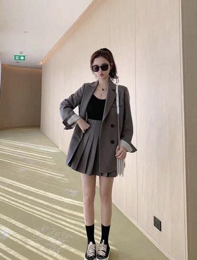其实这样的搭配同样适用于其他的吊带单品,因为很多春季的内搭都是小吊带,因为穿着比较的百搭又很性感,所以在日常生活当中使用率还是高的。小吊带搭配西装外套的话,也是非常的好看的,而下衣我们可以选择一件裙装,百褶款式的就非常的好看,因为会更加显得俏皮可爱比较的元气满满一些。